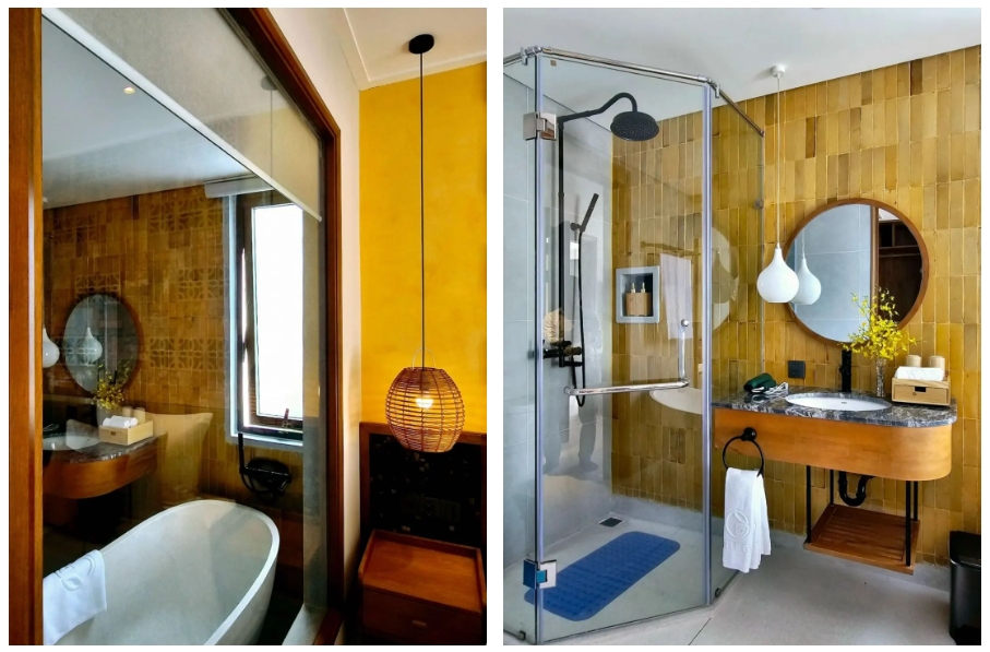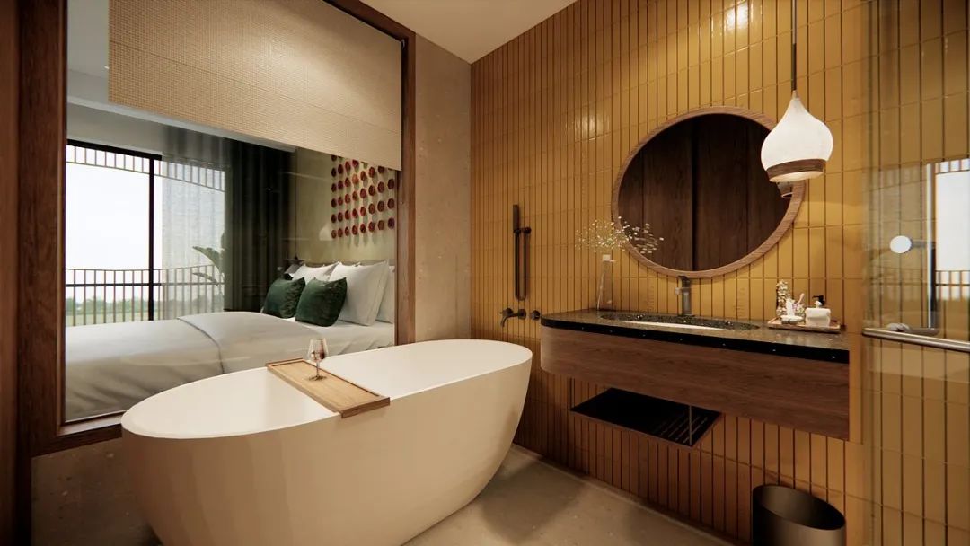 酒店客房內(nèi),配備符合人體工學(xué)的德國COSO衛(wèi)浴浴缸、具備設(shè)計美學(xué)的淋浴花灑和龍頭五金,融合酒店文化打造獨屬于LITTLE GEM風(fēng)格的極致衛(wèi)浴空間。