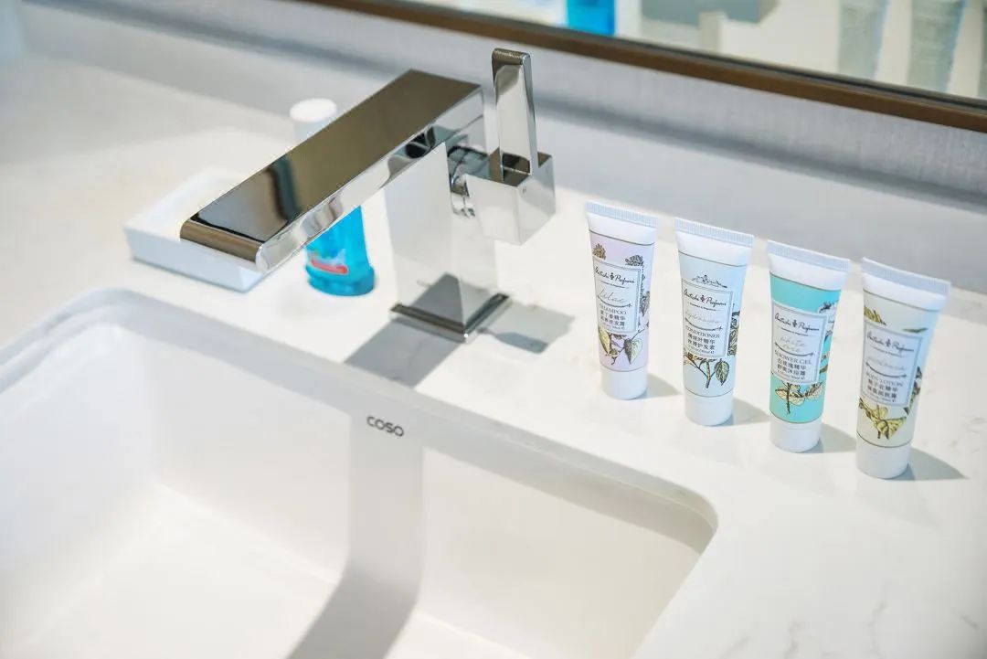 酒店客房內(nèi)精選德國COSO衛(wèi)浴面盆龍頭搭配陶瓷臺下盆,浴缸龍頭和浴缸相匹配,產(chǎn)品的設(shè)計與酒店裝飾風(fēng)格相結(jié)合,營造出一種和諧的之感。