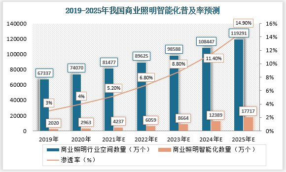 而在智能照明應用領域中,工商業(yè)智能照明應用占比高達57.21%,市場前景可觀。據(jù)數(shù)據(jù)顯示,2020年,我國商業(yè)照明行業(yè)空間數(shù)量為74,070萬個,其中商業(yè)照明智能化數(shù)量為2,963萬個,智能照明在商業(yè)照明領域滲透率為4.0%。預計到2025年,商業(yè)照明智能化滲透率將達到14.9%。