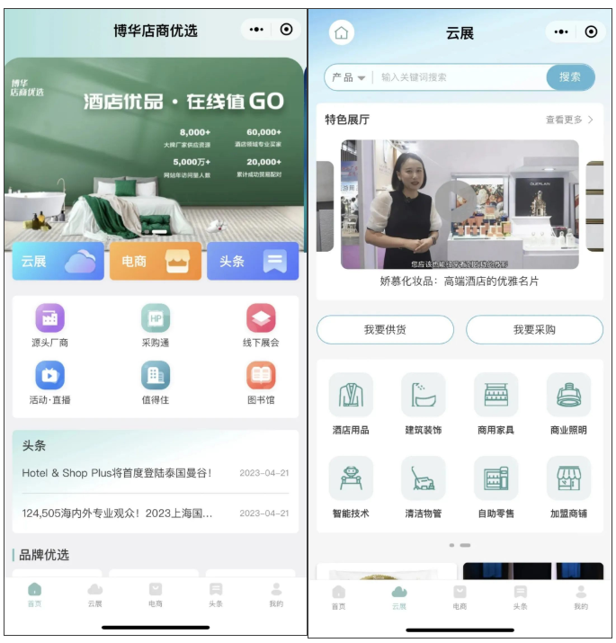 展會推出“博華店商優(yōu)選”小程序,涵蓋線上商城、在線云展、社群私域營銷、貿易配對、知識分享以及直播課堂等特色功能及服務,為酒店及商業(yè)空間行業(yè)供需雙方提供全方位的營銷和交易撮合服務,實現(xiàn)展會一年365天“在線”!