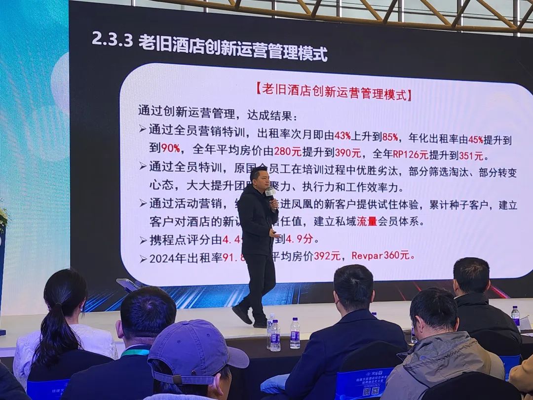 深圳元貞管理有限公司董事長江船做了“破局重生 : 老舊酒店創新運營管理”的主題演講,他以遵義鳳凰大酒店為例進行了詳細的闡述:在其團隊管理前,設施設備老舊、產品力逐步下降,口碑評價差、在顧客心中印象固化、拓新能力差,老會員無法喚醒。通過其團隊管理后,全年平均房價由280元提升到390元,全年RP126元提升到351元。