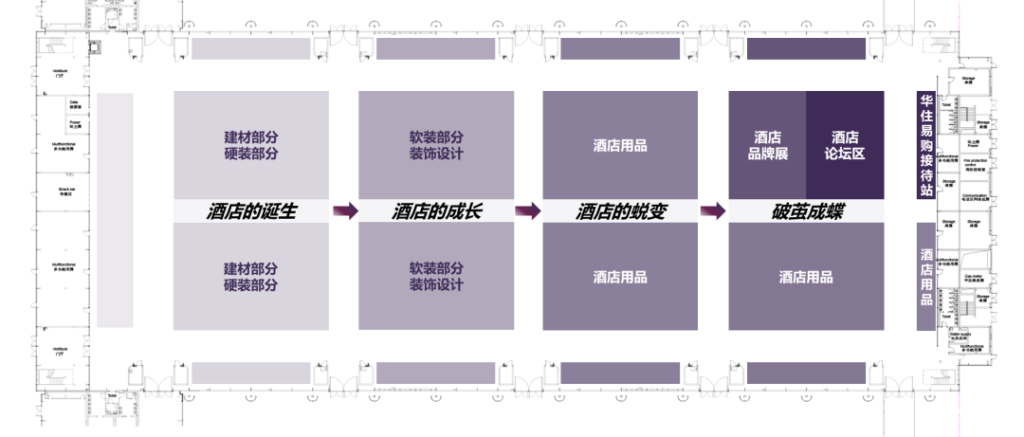 Hotel&Shop Plus為華住E4館策劃了以“破繭成蝶”為主題:與春同行,蝴蝶的翅膀是季節(jié)的聲明,也是一年的念想,從結繭包裹的孕育,到破繭振翅的紛飛,在迷途未遠之時,遁蝴蝶之蹤可抵春天…… 設置“酒店業(yè)全生命周期”的專題館,囊括從酒店的誕生、成長、蛻變到破繭成蝶的完整產(chǎn)業(yè)鏈